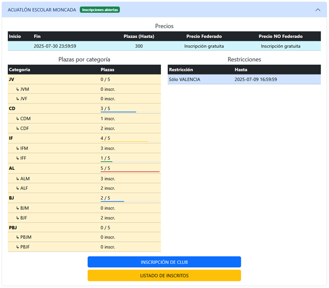 Se muestran datos como las restricciones de provincia, categoría y plazas, actualizadas con los datos en tiempo real: